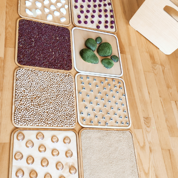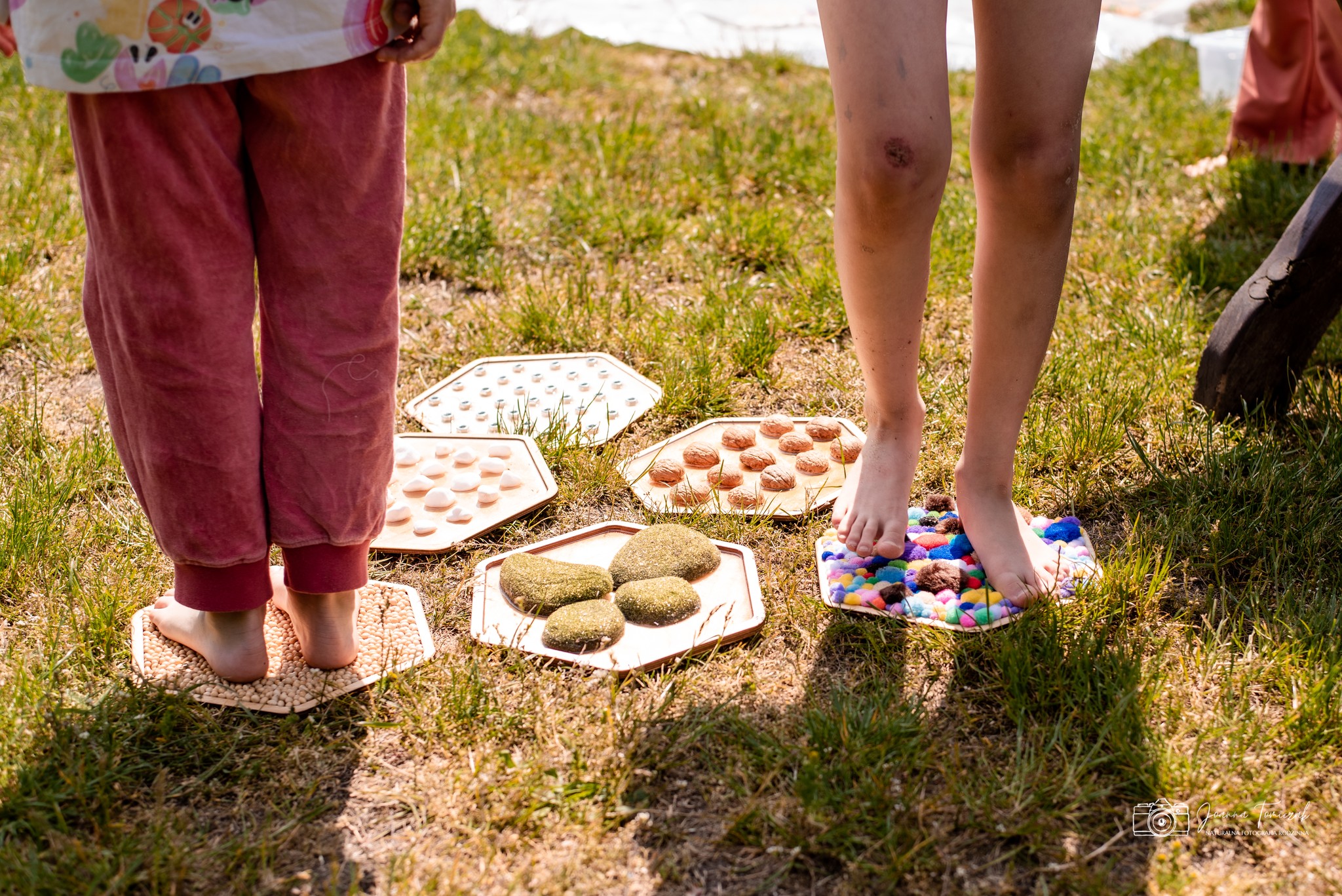 Ścieżka sensoryczna zawiera 10 paneli z różnorodnymi wypełnieniami, które dostarczają bodźców dotykowych.