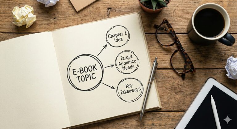 Brief/Konsultacja: Spotykamy się online (lub mailowo), ustalamy cel e-booka, grupę docelową i zbieramy “mięso” (Twoją wiedzę, materiały, notatki).